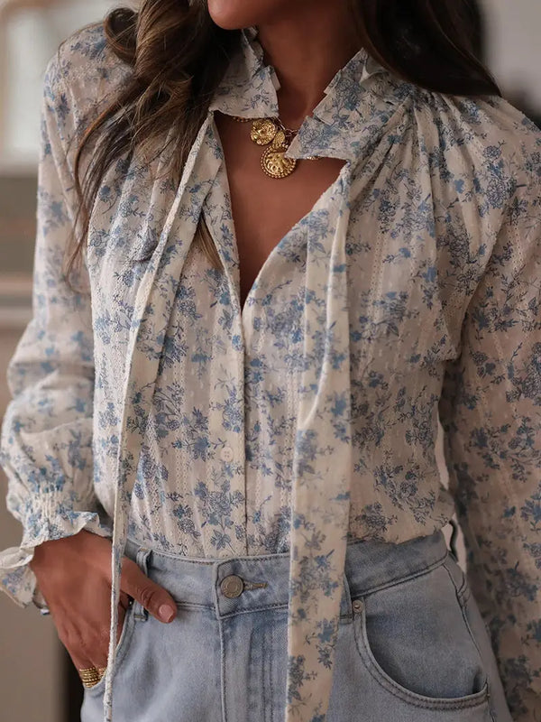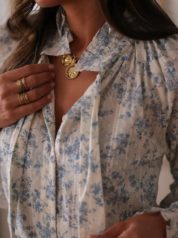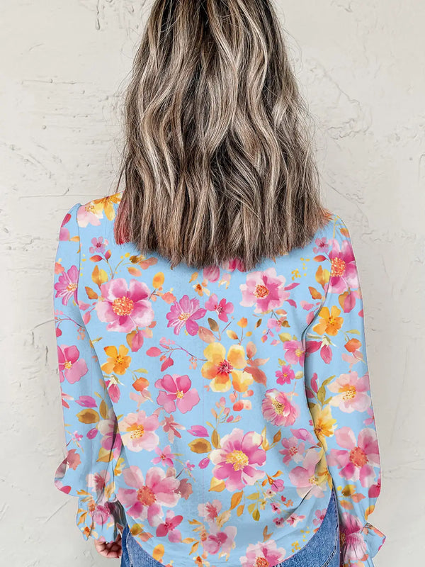 The Meadow Blouse: Floral Smocked Cuff Flounce Sleeve V Neck Blouse