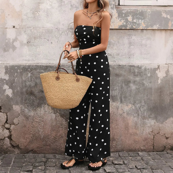The Sweet Spot Jumpsuit: Strapless Polka Dot Wide Leg Jumpsuit
