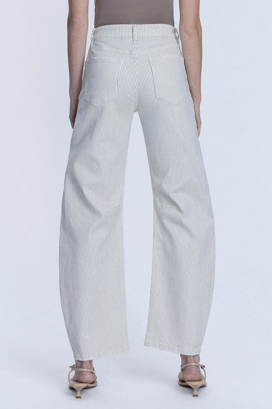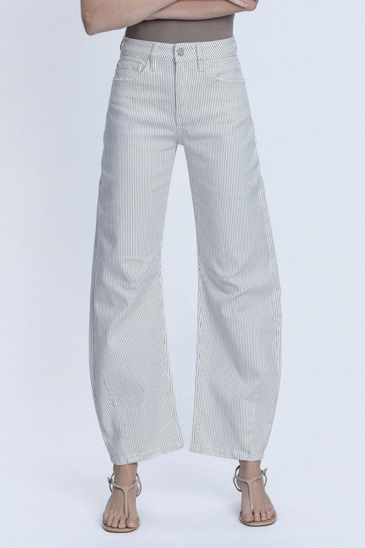 The Jess Jeans are here to steal the show! These striped high-rise barrel jeans combine classic white with bold stripes for a look that's equal parts chic and fun with their fun dart detail. The high-rise cut flatters your silhouette while the barrel leg gives you that effortlessly cool vibe. Perfect for dressing up with heels or keeping it casual with sneakers, these jeans are about to become your new favorite go-to. Stripes never go out of style—make them yours!