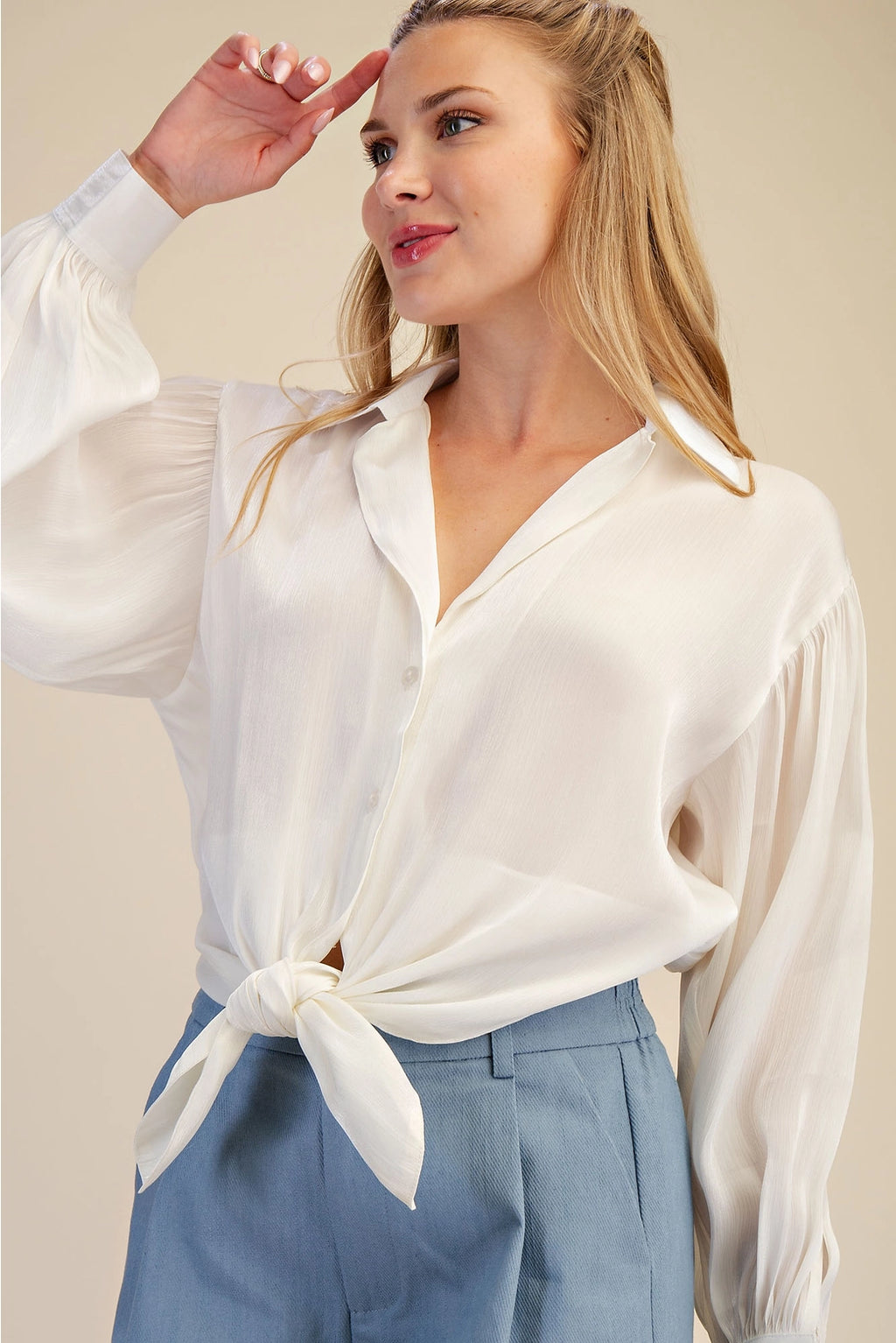 The Stephanie Shirt features a classic collared design elevated by a charming tie-front closure that adds dimension and style versatility. Crafted for the modern woman who values both polish and comfort, this piece transitions seamlessly from office settings to casual outings. The structured collar provides a refined silhouette while the tie-front detail allows you to adjust the fit and create a flattering neckline. Perfect for layering or wearing solo, this shirt pairs effortlessly with tailored trousers, denim, or skirts for countless outfit combinations.