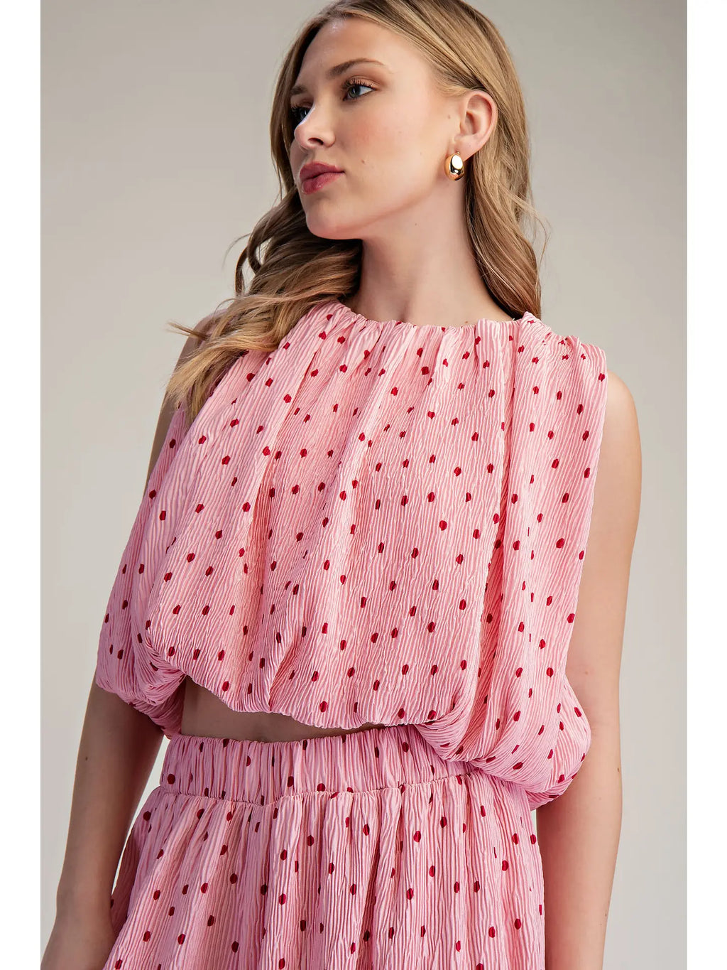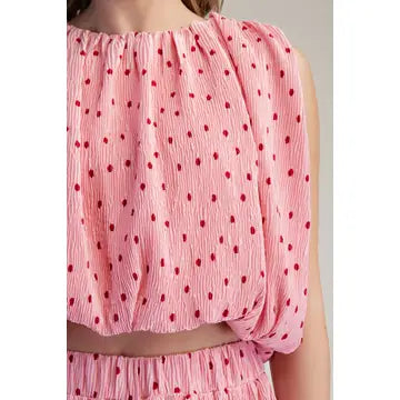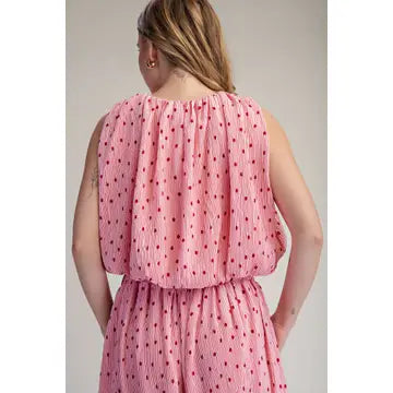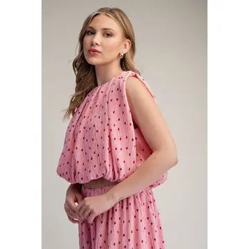 The Tatum Top is your new go-to for effortless style! This sleeveless pleated beauty in soft pink brings movement and dimension to any outfit. Perfect for layering over your favorite tee or wearing solo on warmer days, the structured pleats add visual interest while keeping things breezy and comfortable. Whether you're running errands or heading out for a casual hangout, this versatile top pairs with everything in your closet. Dress it up or down—the Tatum does it all! Matched perfectly with the matching Presley Pants!