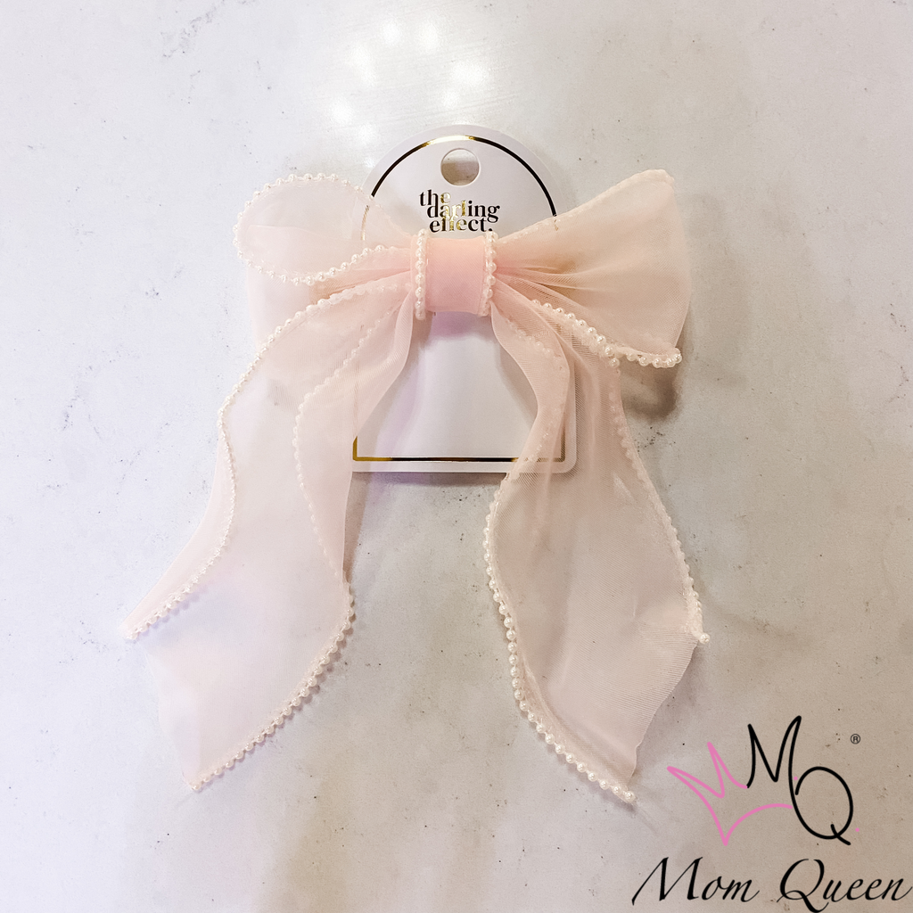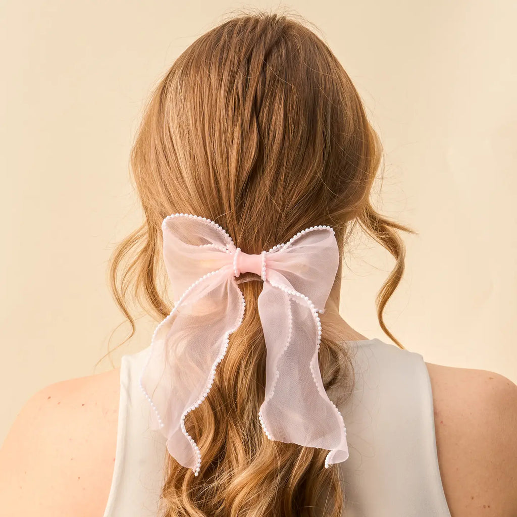 Add a touch of elegance to any look with our Sheer Pearl Hair Bow! Crafted from silky sheer fabric, this chic bow is lined with little pearls for a polished, sophisticated finish. The gold barrette clip closure ensures a secure and comfortable all-day hold, so you can wear it with confidence. Stylish and versatile for any occasion Soft, high-quality fabric with a chic, polished look Secure, comfortable all-day hold Gold barrette clip closure Dims: 7”L x 5”W x 1”H