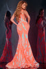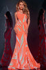 Make a vivid statement in this One-Shoulder Mermaid Sequin Camdyn Gown by Jovani. Featuring a striking print that combines tones of coral and aqua, this floor-length gown captivates with its bold pattern and form-fitting mermaid silhouette. The sleeveless design and one-shoulder neckline ensure a modern and sophisticated look while the open back style adds an extra touch of allure. Perfect for any formal occasion, this gown is crafted from sequin fabric that promises to sparkle and shine, making you the center of attention at any event.